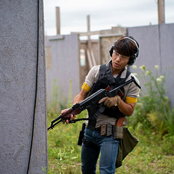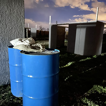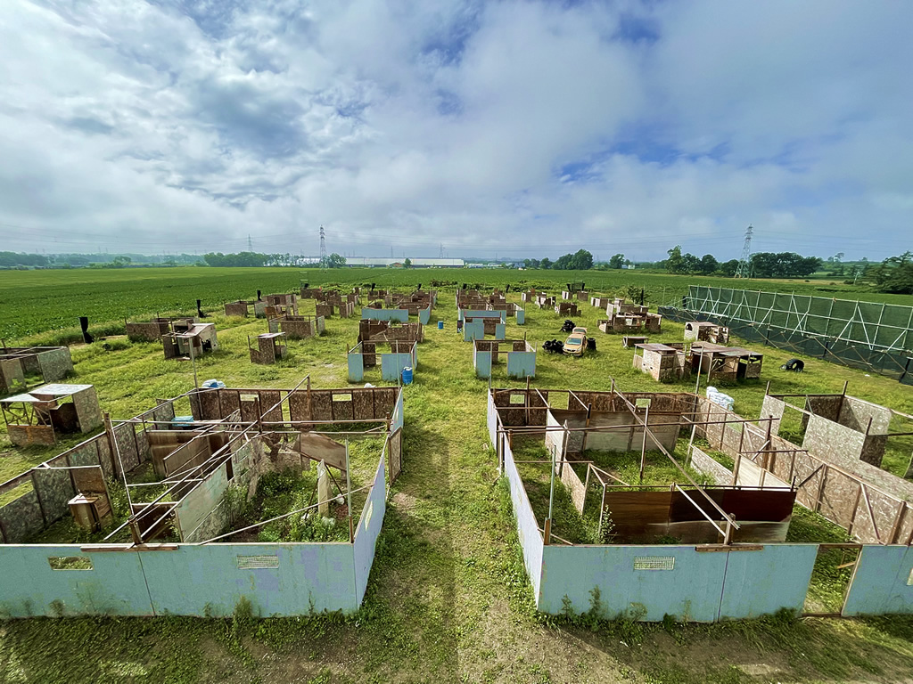 札幌から国道275号線を当別方面へ、途中右側、車で7分、江別市角山にある9280㎡のCQB (市街地) フィールドです。